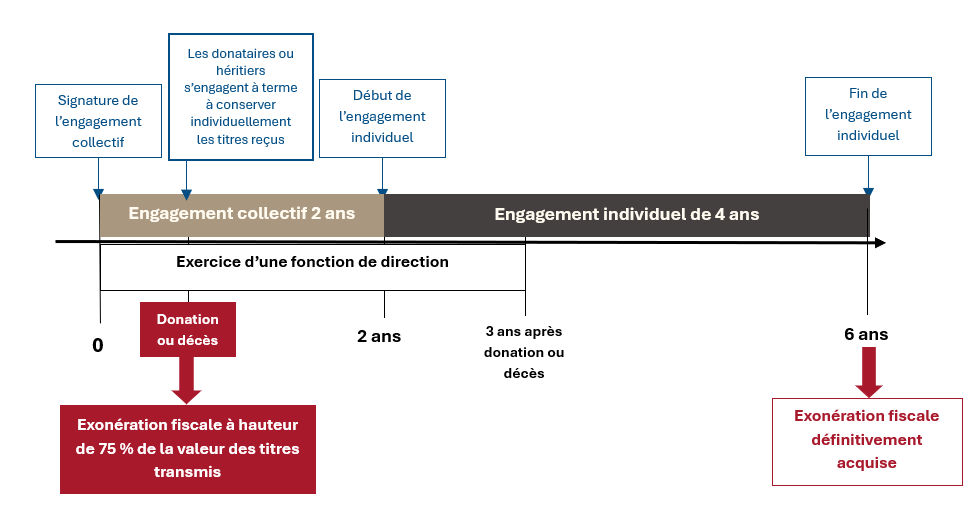 • Vous ou l’un des bénéficiaires devez exercer une fonction de direction dans la société, pendant la durée de l’engagement collectif et pendant les trois années qui suivent la transmission.