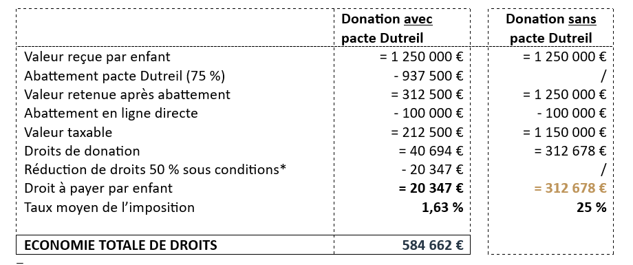 Vous transmettez vos titres de société (bien propre) évalués à 5 000 000 €, et vous avez moins de 70 ans. Vous réalisez, pour cela, une donation-partage en donnant 50 % des titres en pleine propriété à vos deux enfants (vous conservez la moitié de vos titres) soit 2 500 000 €, en bénéficiant du pacte Dutreil.
